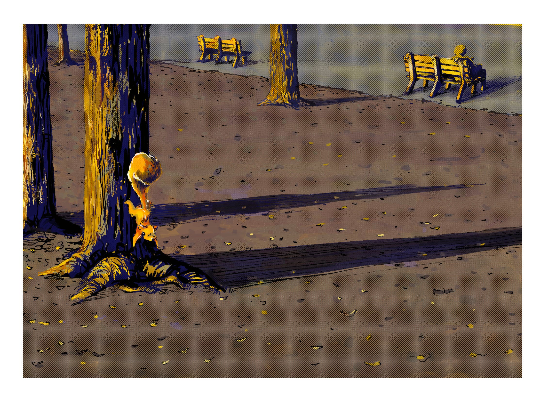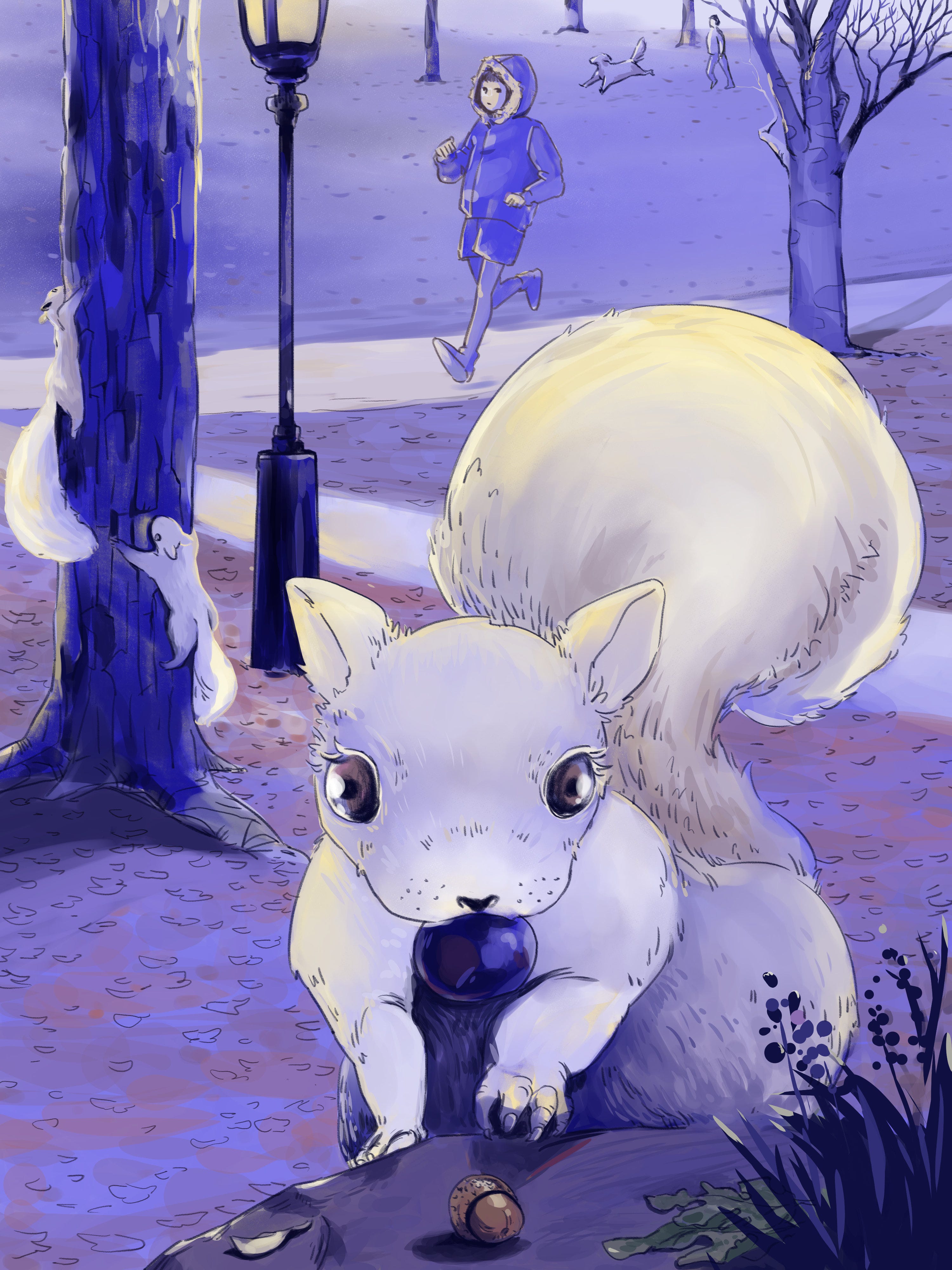 Then I set out to paint yet another park scene, trying to stick to the yellow-purple color scheme with trees and squirrels, and this happened:
